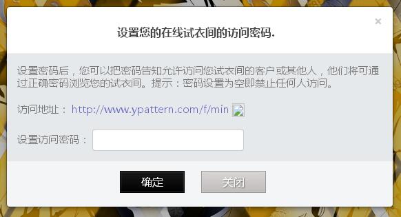 7.當(dāng)你上傳的花型是想給你的客戶看時(shí),你還可以設(shè)置你試衣間的密碼。你試衣間的訪問地址就是彈出框的地址,密碼就是你剛剛設(shè)置的。只要你將這個(gè)試衣間的地址和密碼告訴你的客戶,你的客戶就可以很方便的看到你的花型并能更真實(shí)體驗(yàn)在產(chǎn)品上的效果。