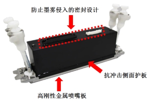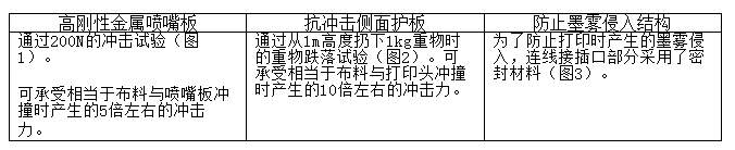 1. 通過(guò)采用高剛性金屬噴嘴板以及抗沖擊側(cè)面護(hù)板,提高了抵抗布料沖擊的能力。而且,防墨霧的構(gòu)造可以防止墨霧或者纖維侵入。