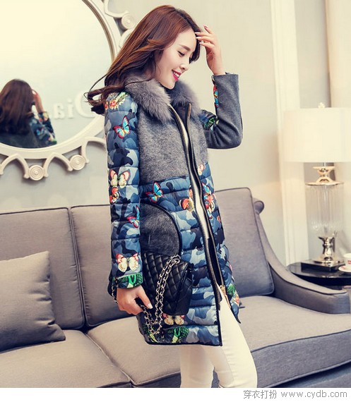 蝴蝶飛來(lái)了,落在了一直不起眼的羽絨服上,讓人覺(jué)得冬天不那么無(wú)聊。貂絨拼接,高級(jí)灰期待你的別樣演繹。迷彩印花的方式改變了色彩,藍(lán)色系似乎更加溫婉,與蝴蝶翩翩飛舞的情愫遙相呼應(yīng)。