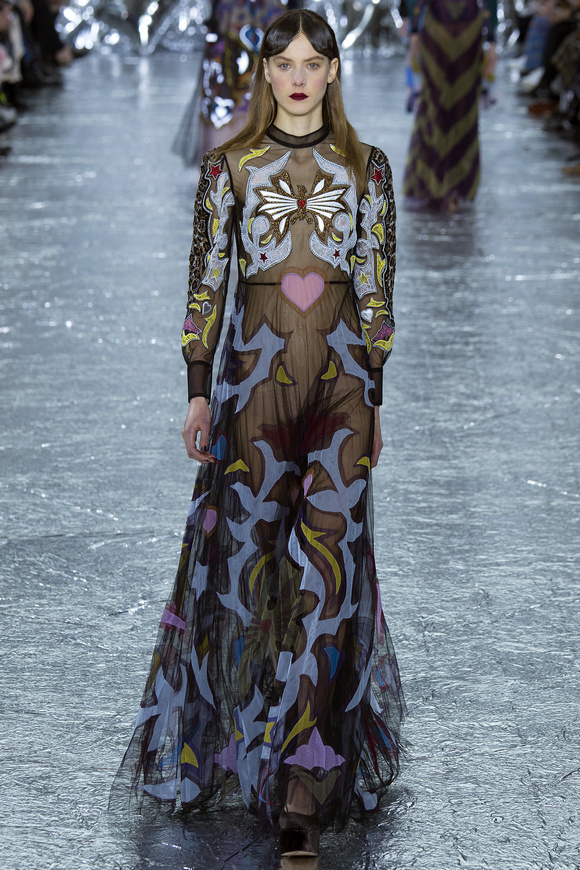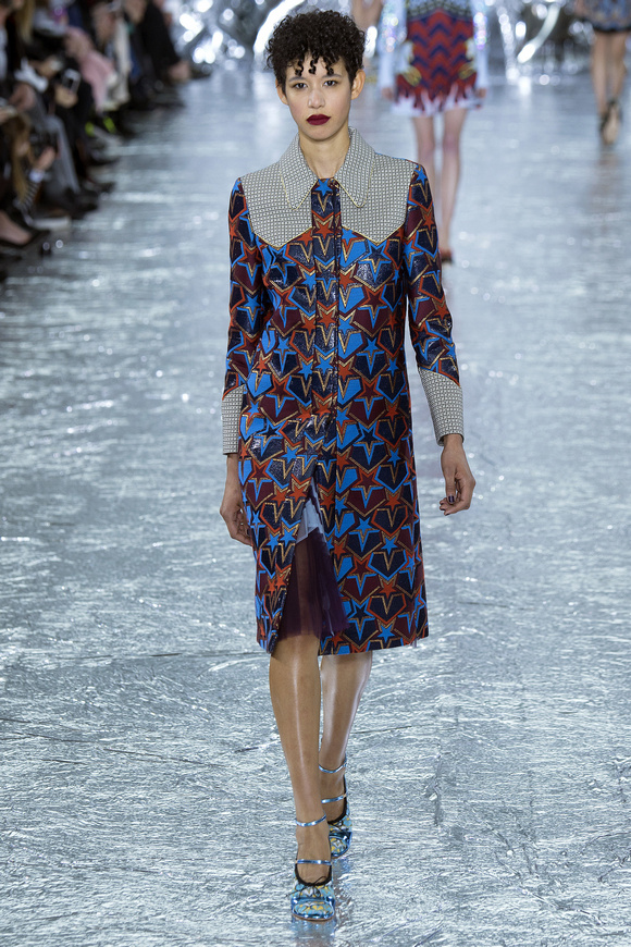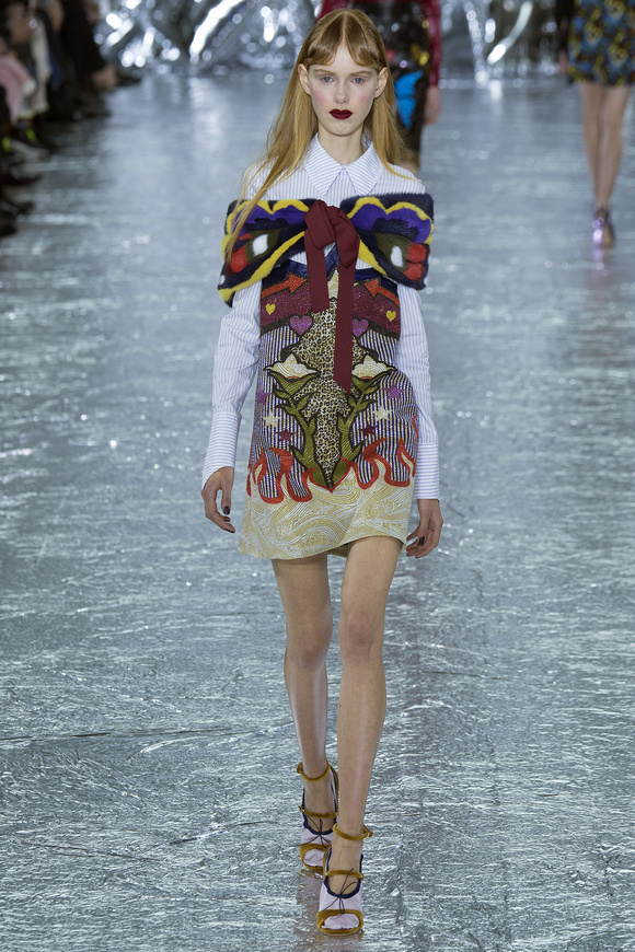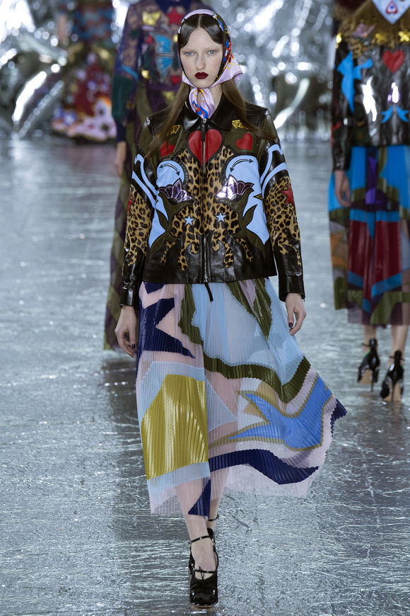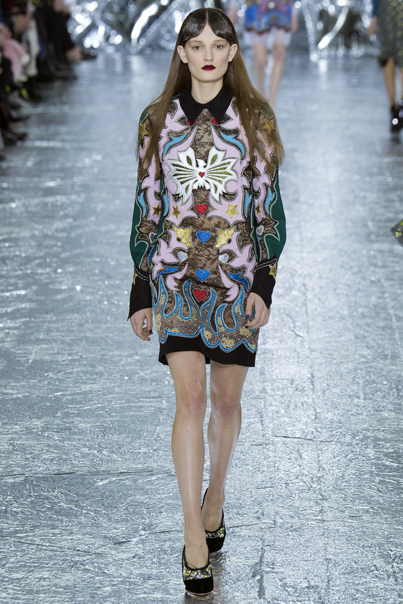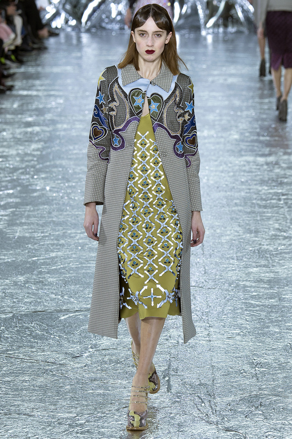 Mary Katrantzou 在她的發(fā)布會(huì)后臺(tái)說(shuō)起她的戀愛(ài),當(dāng)時(shí)她非常樂(lè)衷于把她的第一個(gè)孩子打扮成西部牛仔或者芭蕾舞者。這次秋冬發(fā)布會(huì)的靈感,來(lái)自于她自己的浪漫,對(duì)于美國(guó)50年代西方的風(fēng)格的成謎,一套方方正正的西裝,里面是肩膀帶有裝飾的西部牛仔風(fēng)格的襯衣。Mary Katrantzou用高貴且華麗的迷醉印花表達(dá)著她對(duì)那個(gè)年代的情結(jié)與懷念。在每一件服裝上都能看出設(shè)計(jì)師的巧思與智慧,簡(jiǎn)潔的輪廓與傳統(tǒng)繁復(fù)印花風(fēng)格形成鮮明的對(duì)比,表現(xiàn)出昔日紙醉金迷時(shí)期最迷人的貴族女郎形象。