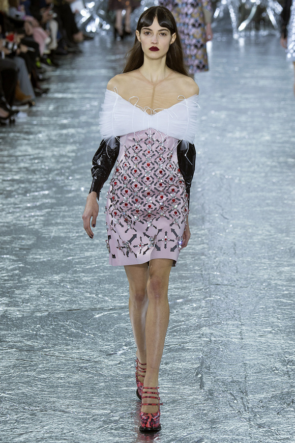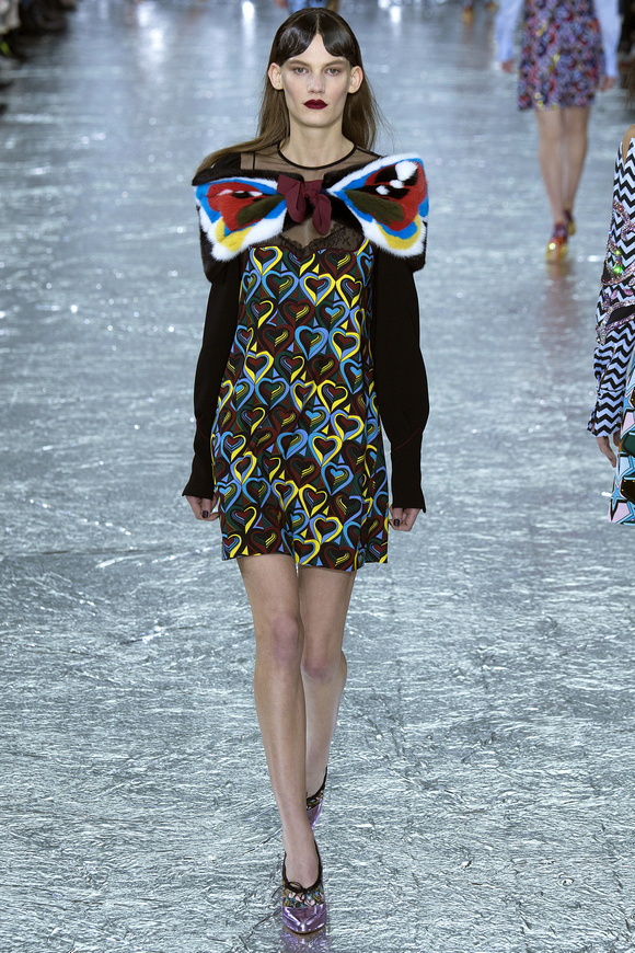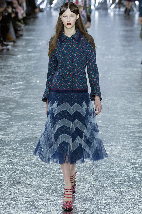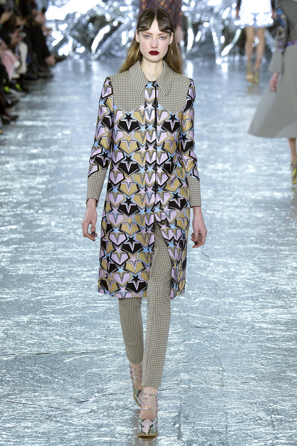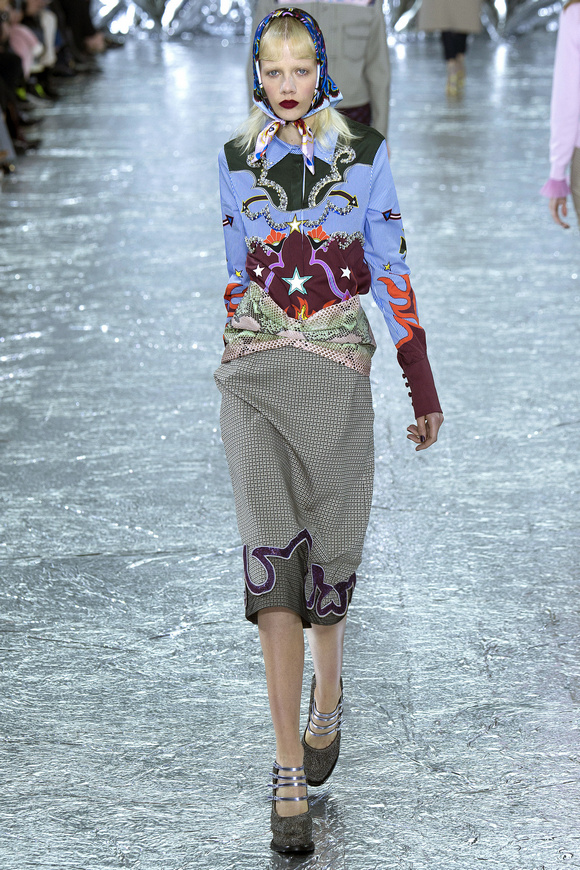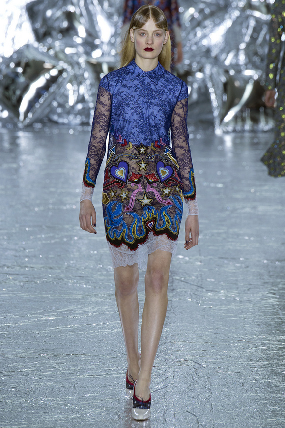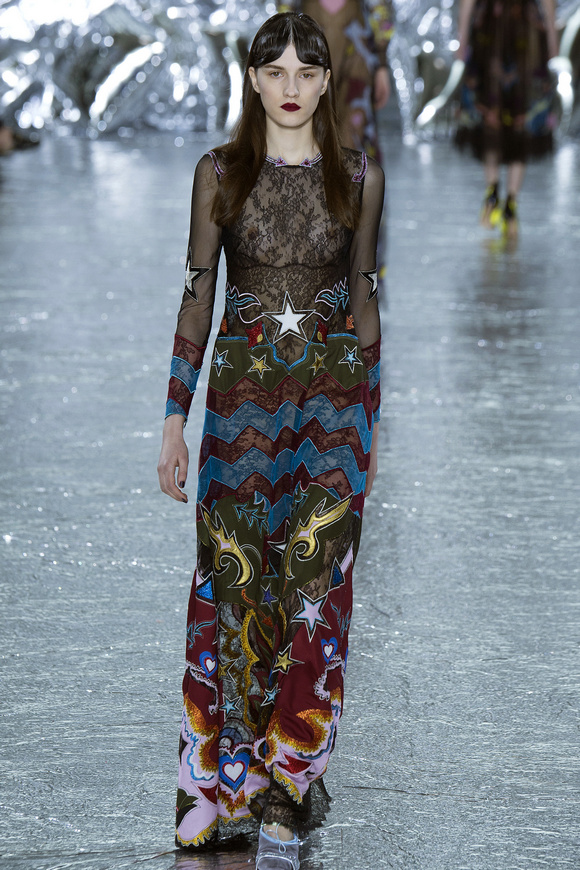 Mary Katrantzou 在她的發(fā)布會(huì)后臺(tái)說(shuō)起她的戀愛(ài),當(dāng)時(shí)她非常樂(lè)衷于把她的第一個(gè)孩子打扮成西部牛仔或者芭蕾舞者。這次秋冬發(fā)布會(huì)的靈感,來(lái)自于她自己的浪漫,對(duì)于美國(guó)50年代西方的風(fēng)格的成謎,一套方方正正的西裝,里面是肩膀帶有裝飾的西部牛仔風(fēng)格的襯衣。Mary Katrantzou用高貴且華麗的迷醉印花表達(dá)著她對(duì)那個(gè)年代的情結(jié)與懷念。在每一件服裝上都能看出設(shè)計(jì)師的巧思與智慧,簡(jiǎn)潔的輪廓與傳統(tǒng)繁復(fù)印花風(fēng)格形成鮮明的對(duì)比,表現(xiàn)出昔日紙醉金迷時(shí)期最迷人的貴族女郎形象。