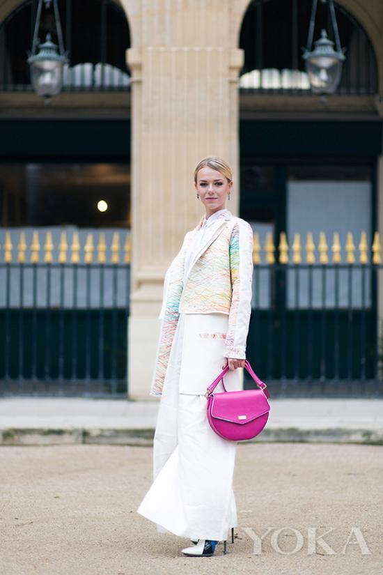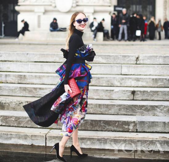 博主Sandra Kleine Staarman身上這件Leonard印花裙,狂放不羈的藝術(shù)筆觸渲染出飽和度極高的抽象印花,搭配濃郁深厚的暗調(diào)上衣與高跟鞋,顯得極為時(shí)髦、高級(jí)。不落窠臼的法式優(yōu)雅,散發(fā)著令人陶醉的女人味。比起Sandra波普風(fēng)格的濃艷重彩,同為抽象印花也可穿出淡雅風(fēng)格,博主MarynaKovaltchuk用剪裁精良的Leonard像素印花短外套搭配曳地白色長(zhǎng)裙,清新典雅,含蓄端莊,古典精致的造型宣告出街頭的自我個(gè)性。