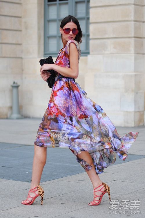 這款雪紡印花裙十分輕盈,飄逸裙擺在夏天的風中翩翩起舞,唯美夢幻,女人味十足,配紅色綁帶高跟鞋精致又性感。