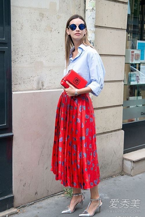 淺藍襯衫知性又帥氣,配紅色印花百褶長裙瞬間變得女人味十足,優(yōu)雅精致,帶著復古氣息。