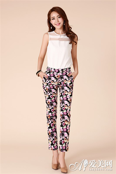 顏色繽紛的印花九分褲,夏日搭配背心非常時(shí)尚休閑。推薦純色、雪紡、復(fù)古系列的印花背心搭配。