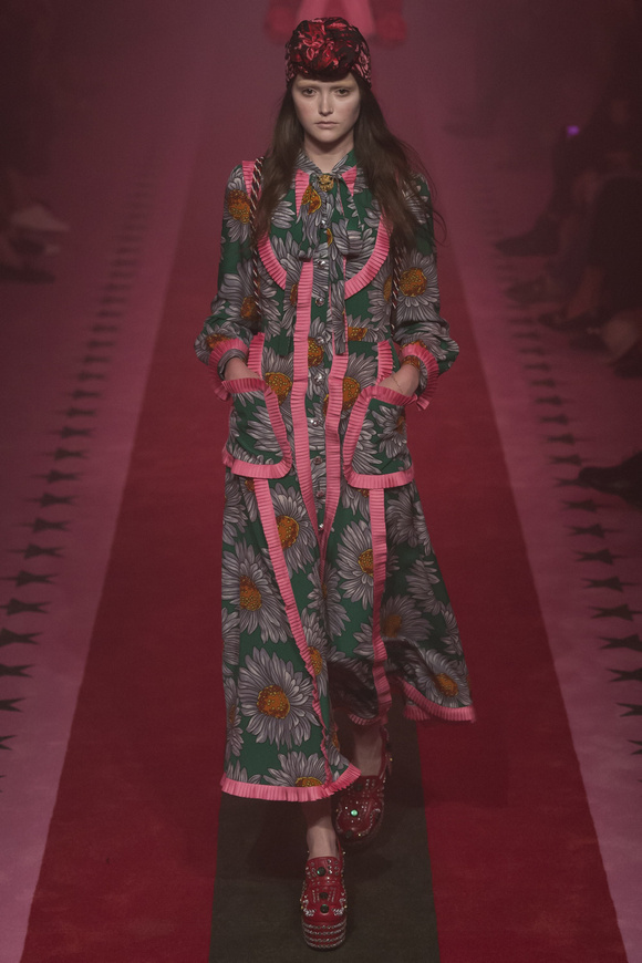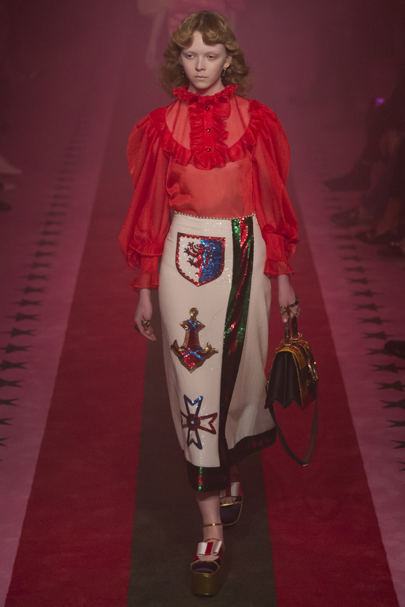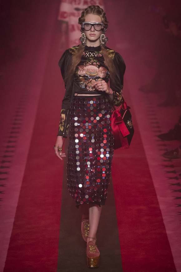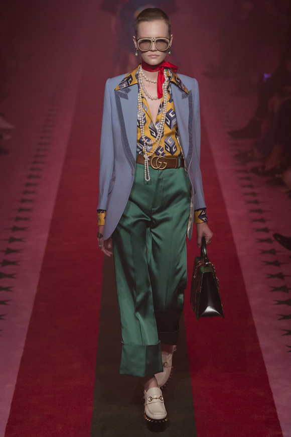 2017 Gucci 的春季發(fā)布會,像在70年代夜總會一樣。服裝充滿刺繡、印花、大墨鏡、尼夾克、閃亮的面料。整場發(fā)布會是對20世紀(jì)流行文化的千變?nèi)f化的應(yīng)用。