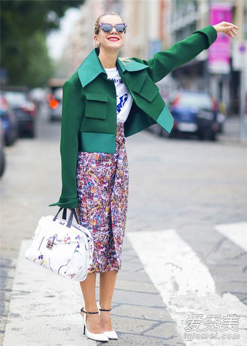 拼接草木綠皮衣,內(nèi)搭白T和碎花裙,清新得賞心悅目。
