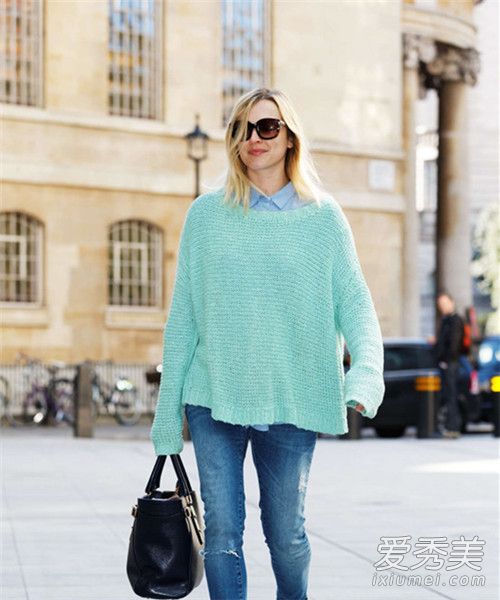 草木綠毛衣搭配藍色牛仔褲,清新又時髦。