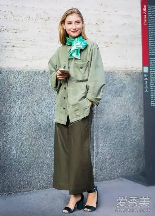 單一的草木綠軍裝風(fēng)大衣就很好看,怕過于凌亂就選擇一件單品就好。