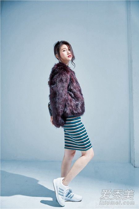 球鞋讓整體,不性感過(guò)頭,貼身裙 皮草容易太惹火,踩上球鞋就不會(huì)好艷麗,變成平常也可穿的搭配。