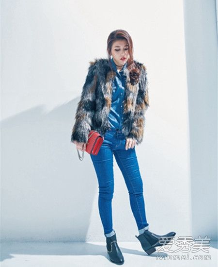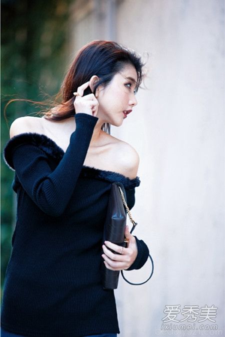 露肩上衣女人味十足,領(lǐng)子特別滾了一圈皮草,看起來(lái)好有冬天FU,搭上牛仔褲減弱美艷感。