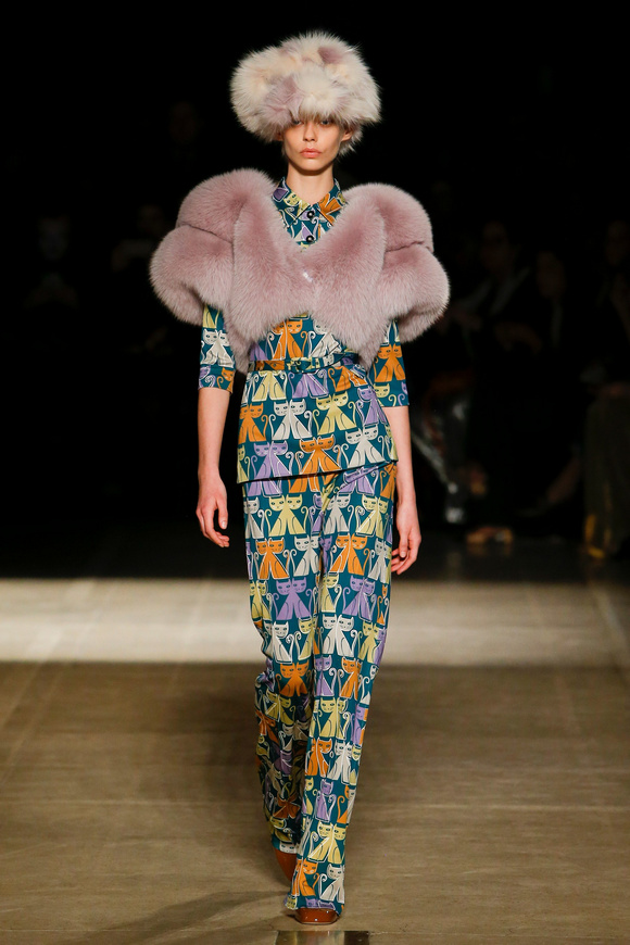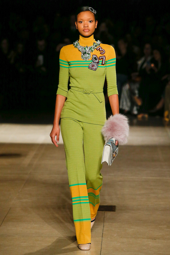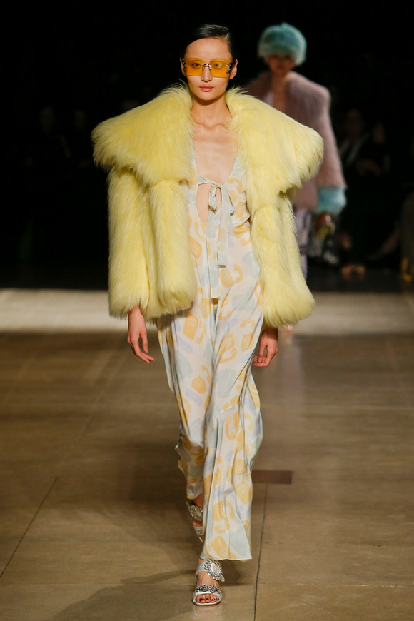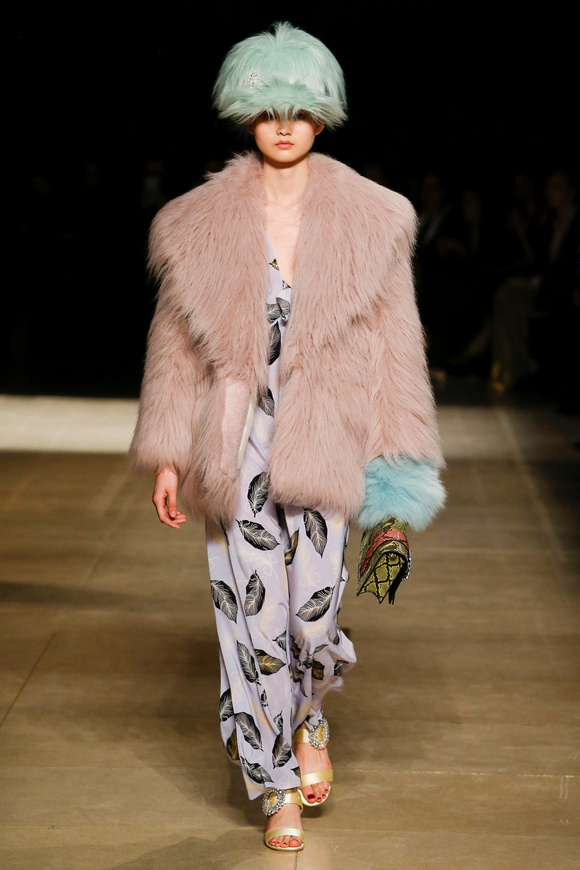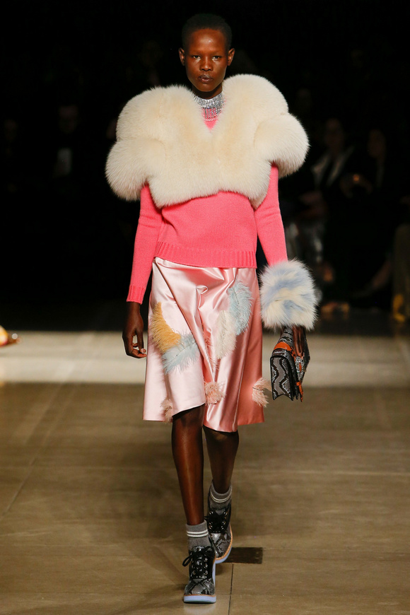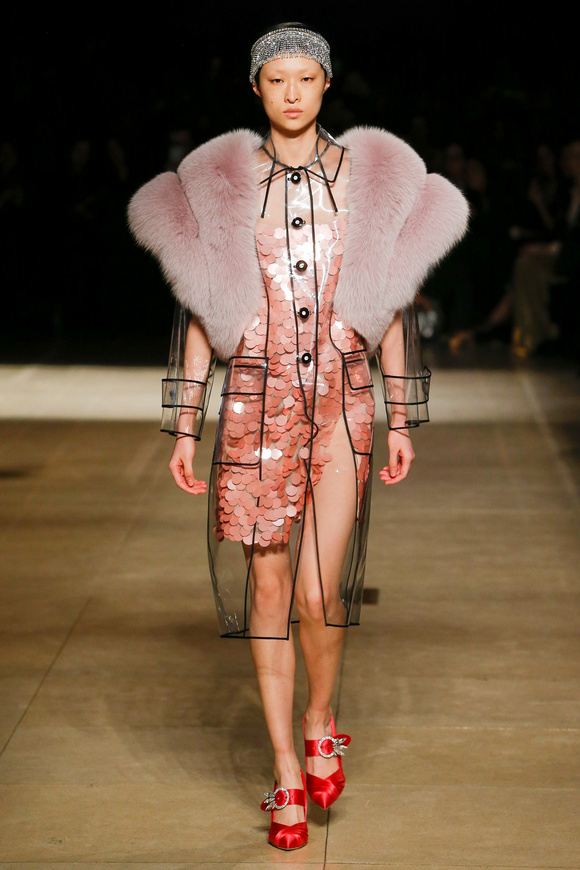 Miu Miu這一季的設(shè)計有融合各種族的女性和背景。毛茸茸的皮草,束腰外衣和閃亮的人造鉆石和亮片,還點綴這巨大的太陽眼鏡。
