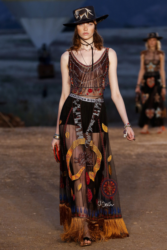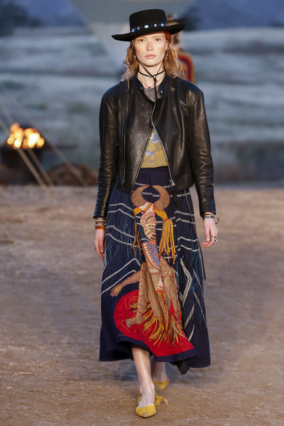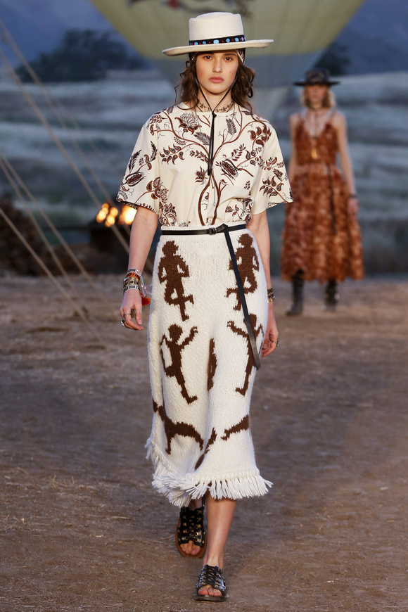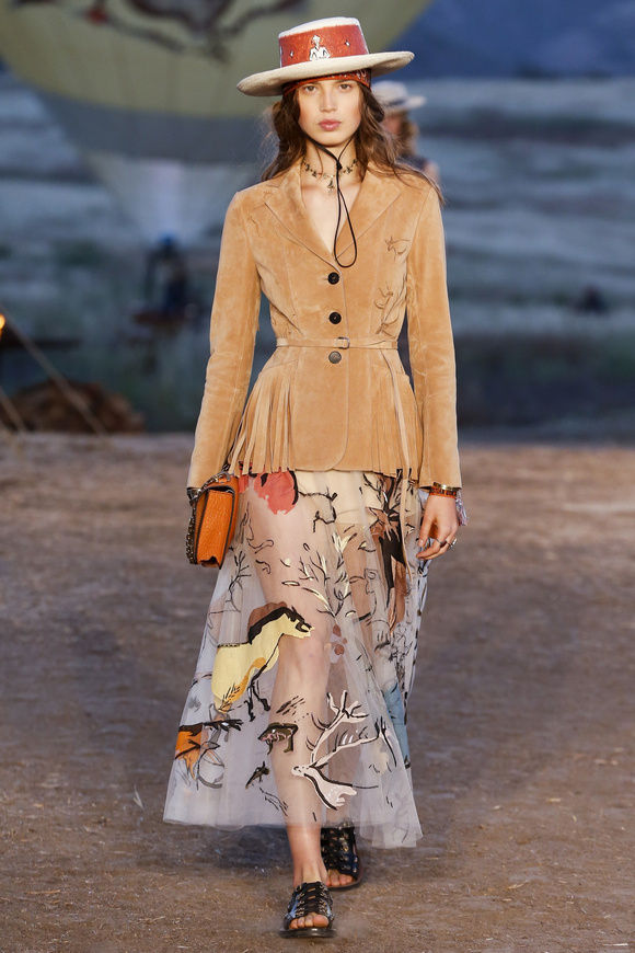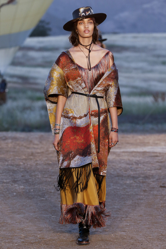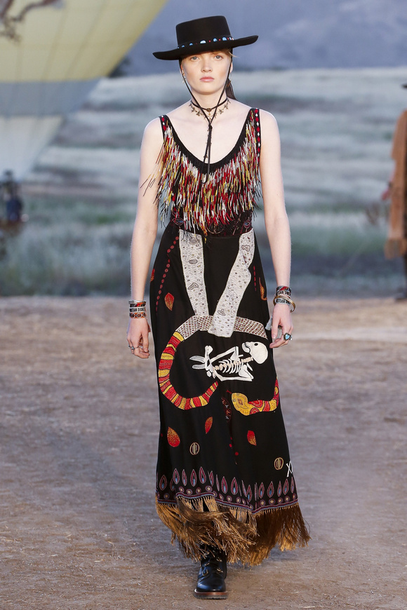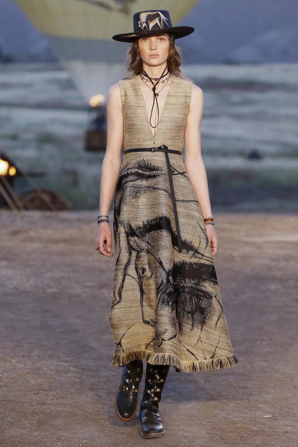 Chirstian Dior 克里斯汀 迪奧 這一季的時裝發(fā)布會挑在洛杉磯舉行,設(shè)計的靈感來自十年前在法國西南部的古代壁畫,要與自然的要素聯(lián)系在一起,譬如美洲獅、響尾蛇等等。裙子和披風(fēng)都有拉斯科草圖、酒椰葉纖維提花、塔羅牌的插圖、和柔軟的印花皮草、還有珠繡的牛仔也是一大兩點。