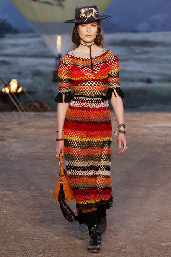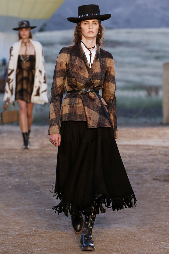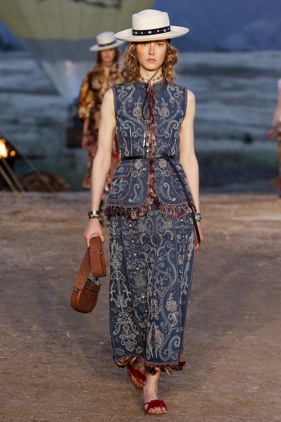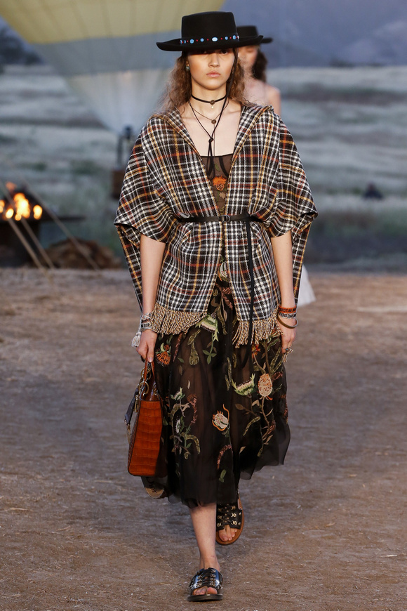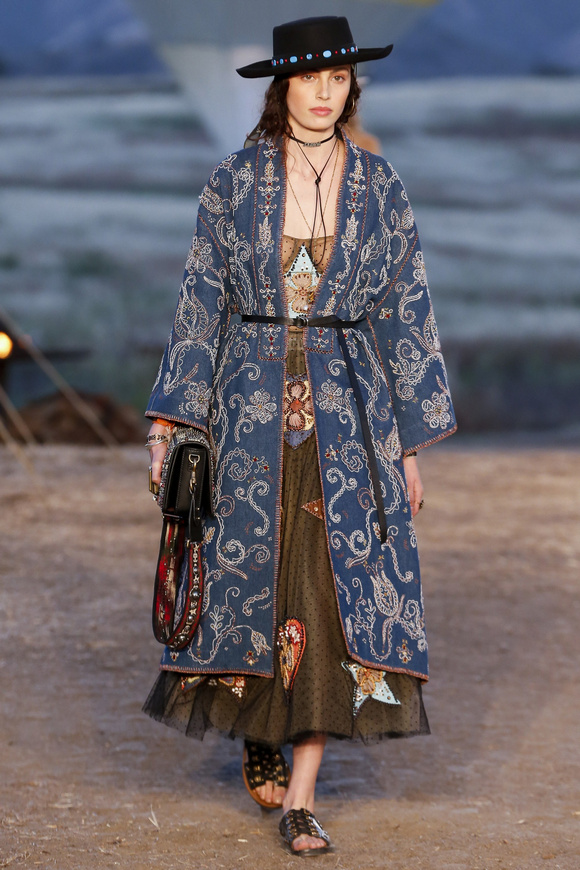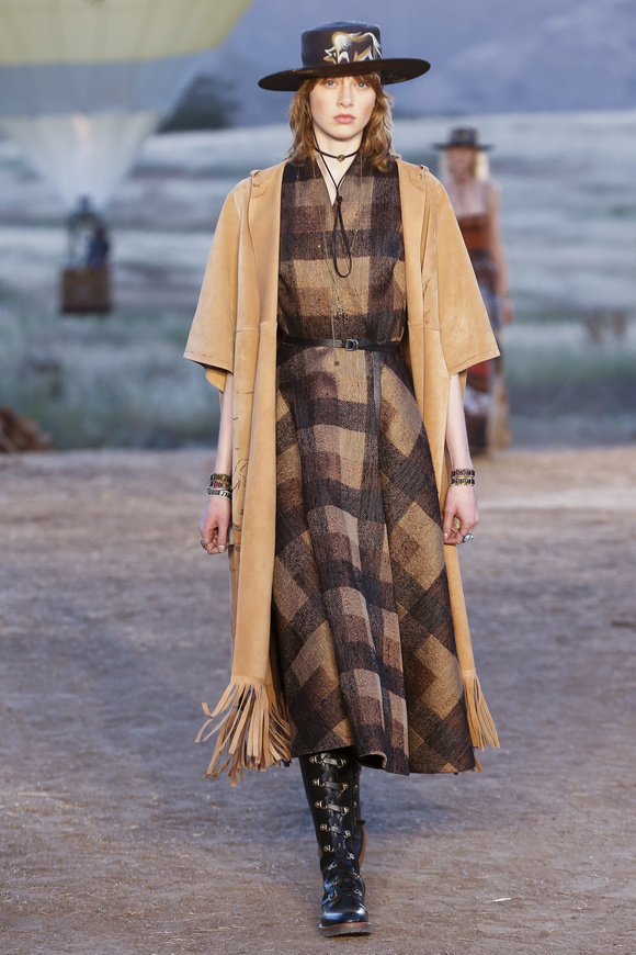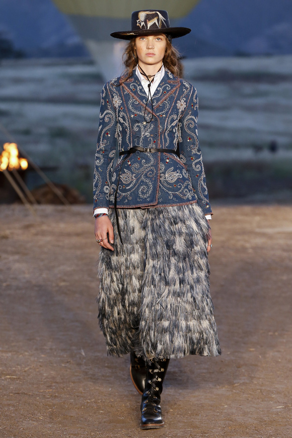 Chirstian Dior 克里斯汀 迪奧 這一季的時裝發(fā)布會挑在洛杉磯舉行,設(shè)計的靈感來自十年前在法國西南部的古代壁畫,要與自然的要素聯(lián)系在一起,譬如美洲獅、響尾蛇等等。裙子和披風(fēng)都有拉斯科草圖、酒椰葉纖維提花、塔羅牌的插圖、和柔軟的印花皮草、還有珠繡的牛仔也是一大兩點。
